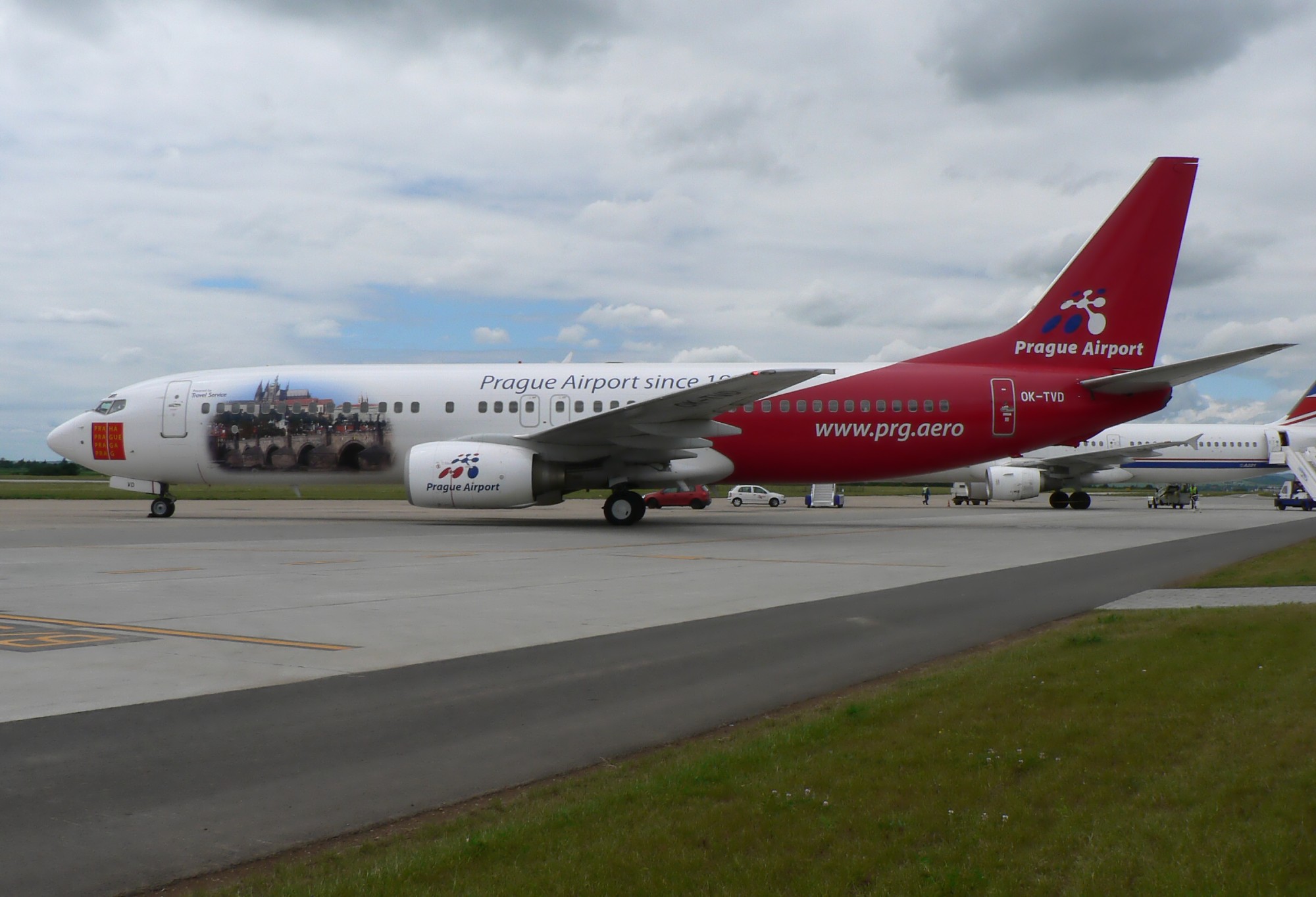 Popis: Boeing 737-800 české charterové společnosti Travel Service. Letoun je vybaven zvláštní barevnou úpravou k výročí založení ruzyňského letiště (1937), na obou bocích přední části je fotografie pražského panorama.