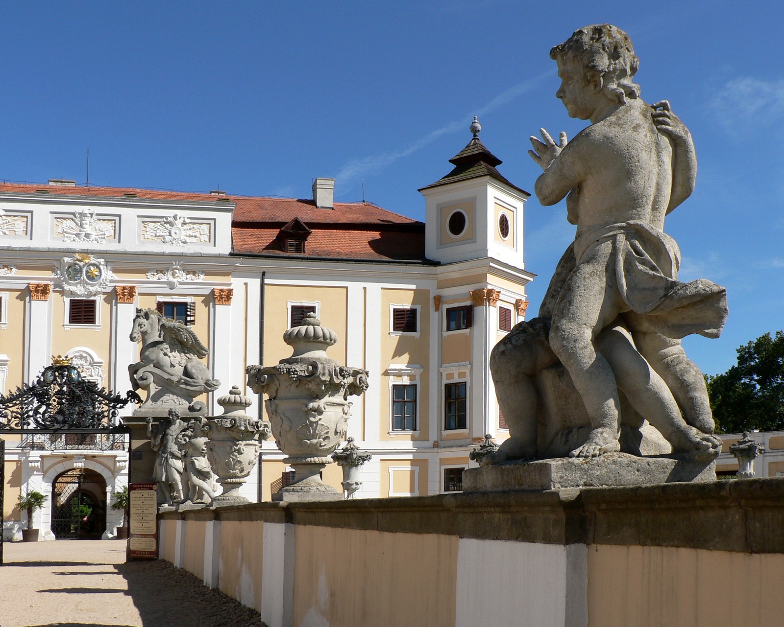 Popis: Pohled na čelní část milotického zámku, sochařská výzdoba na mostě přes západní příkop a vstup na první nádvoří...