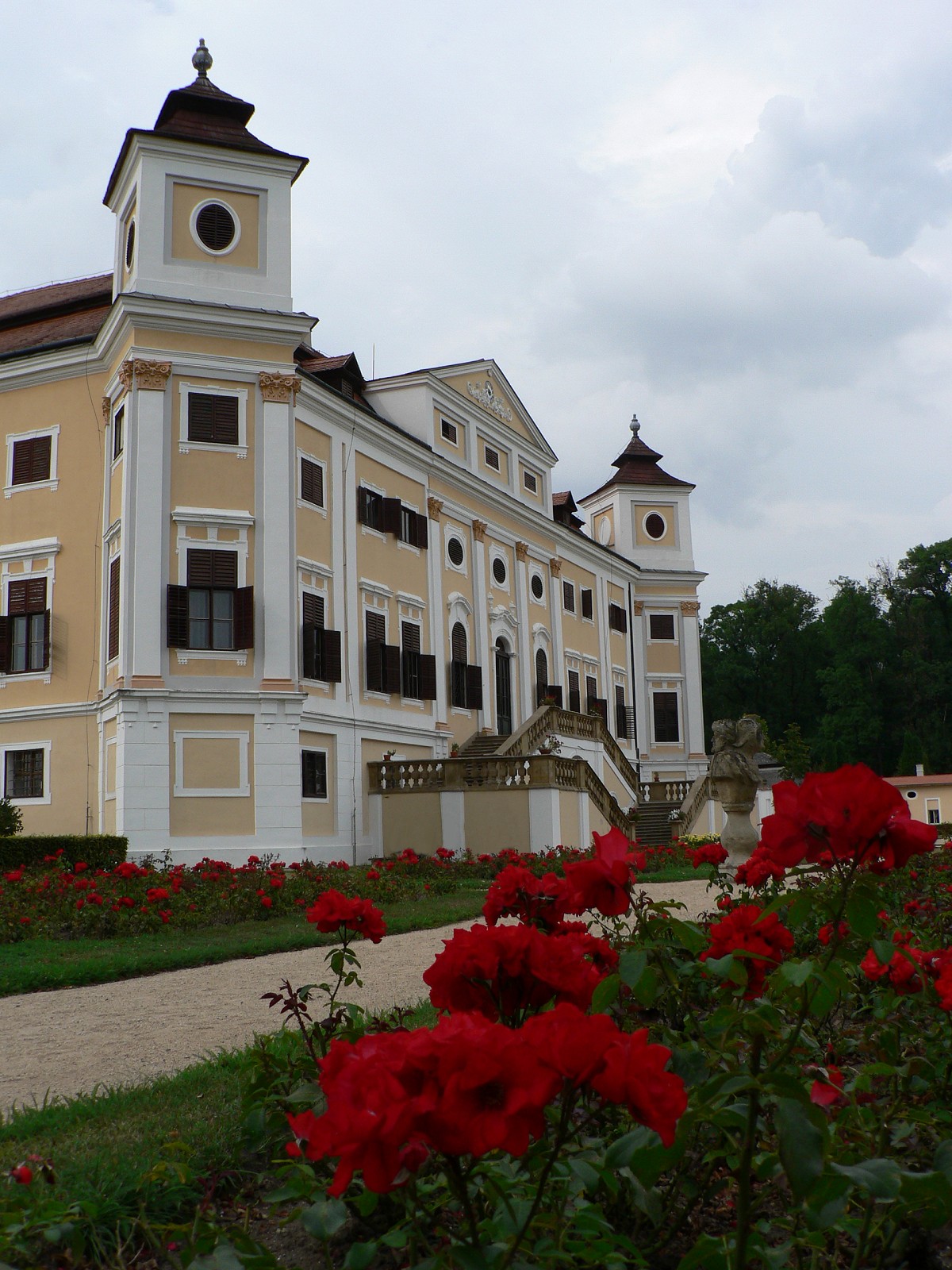 Popis: Pod okny do zámecké zahrady se rozprostírají velké záhony rudých růží...