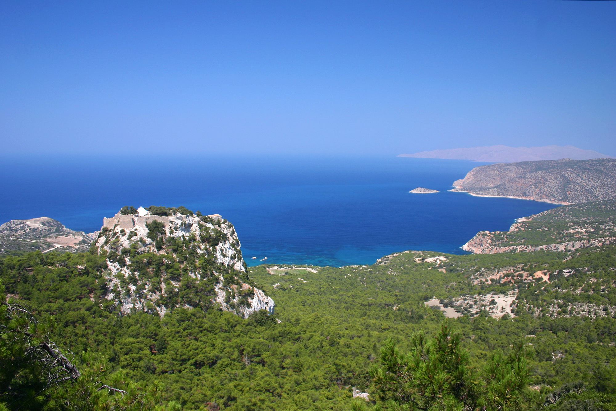 Popis: Pohled na Egejské moře a pozůstatky hradu Monolithos, který na jihozápadní straně ostrova Rhodos vybudovali Johanité.