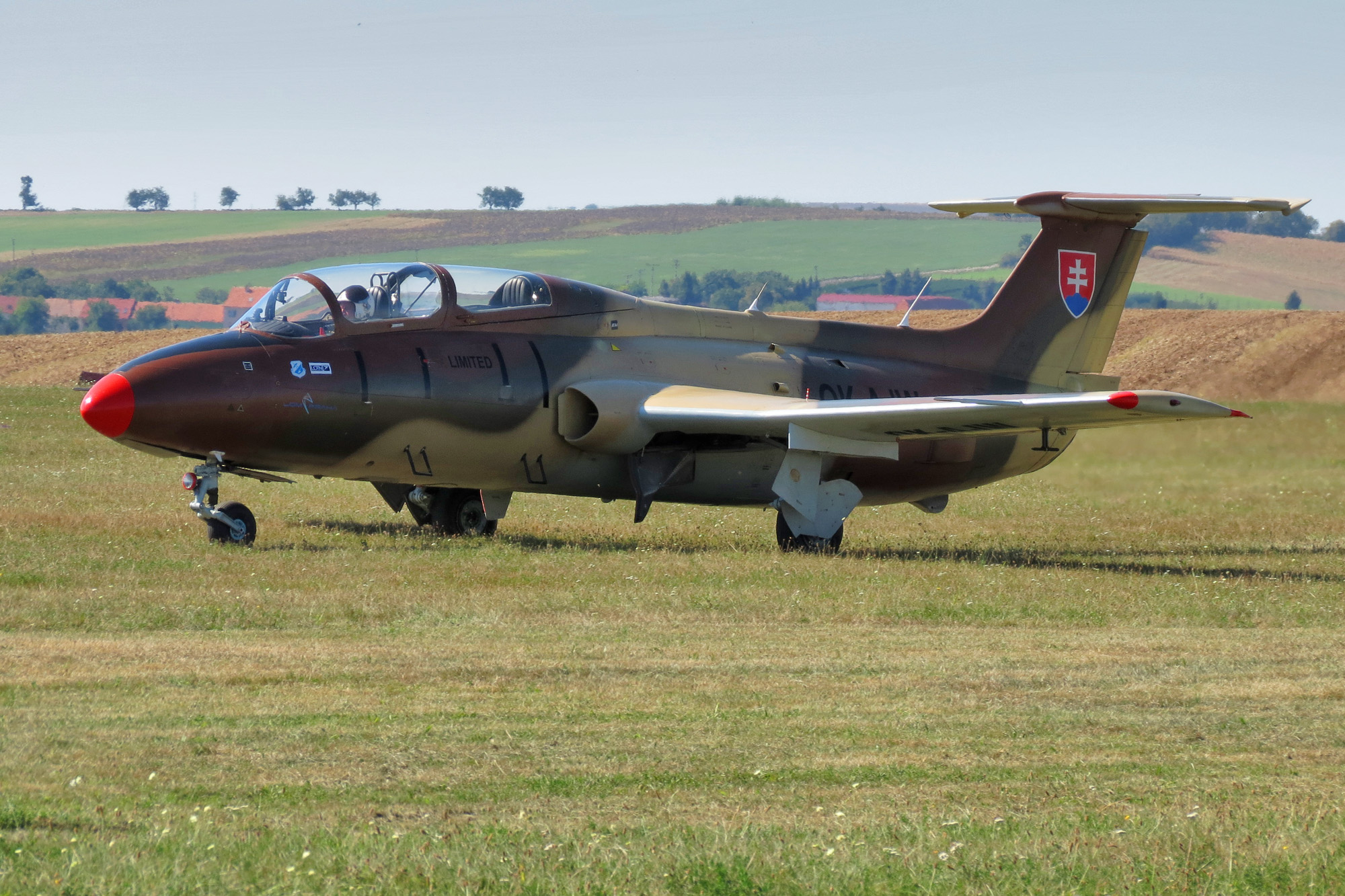Popis: Cvičný proudový letoun Aero L-29 Delfín ve slovenských barvách, ale s českou registrací OK-AJW patřící společnosti Blue Sky Service na Polétání v Kyjově 9. září 2012.